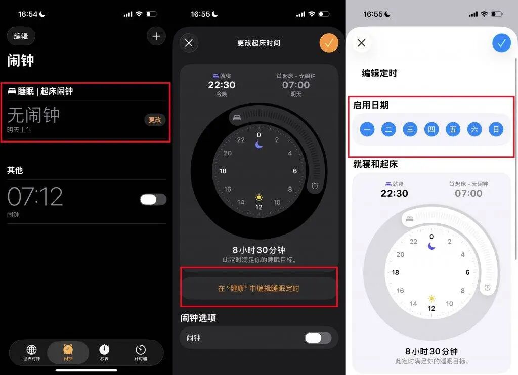 打开「时钟」App,设置「睡眠|起床闹钟」,设置就寝时间和起床闹钟,启用日期要选周一到周日。