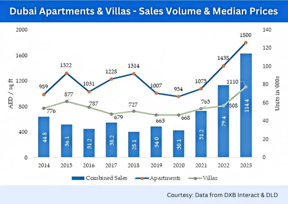 迪拜公寓与别墅销售量和中位数价格