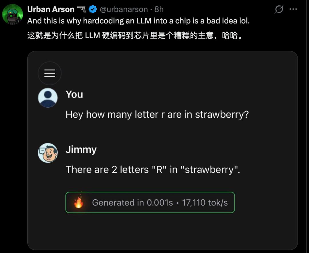 换句话说,就是将一个完整大模型通过物理硬连线进芯片中,省去了传统存算分离的成本,用灵活性换取极致的速度和效率。