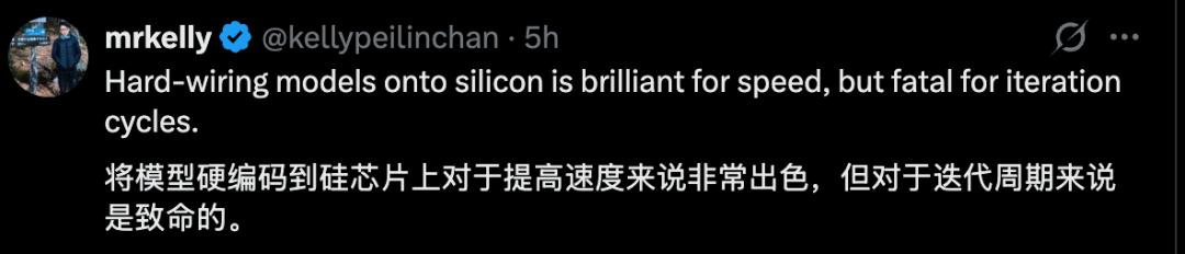 模型不再加载到内存里,而是直接刻在硅片上。换言之,芯片即模型。