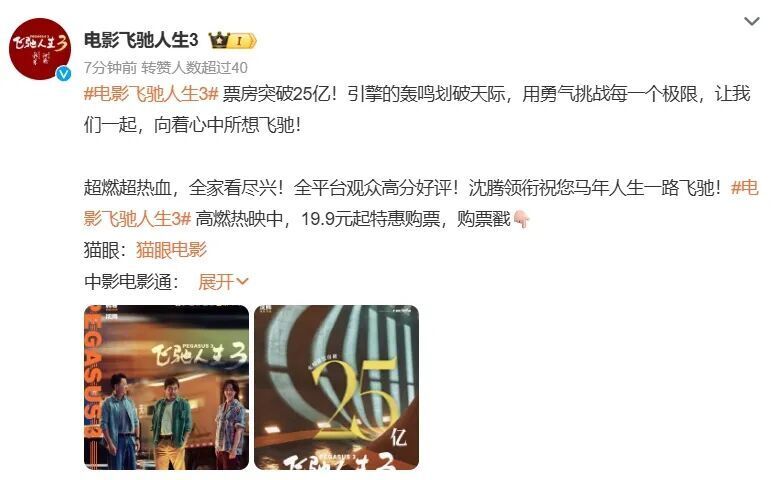 《飞驰人生 3》一路领跑的票房表现,也让背后的出品方率先收获了市场红利。据“趣解商业”了解,《飞驰人生3》主要出品方为亭东影业、猫眼娱乐、大麦娱乐、万达影视和博纳影业。“天眼查”显示,亭东影业董事长为韩寒,韩寒、博纳影业、大麦娱乐分别持股亭东影业57.3%、9.6%、9.1%的股份。按猫眼专业版预测最终票房40亿元、片方分成40%计算,博纳影业和大麦娱乐通过《飞驰人生3》至少能获得数亿元的收入。