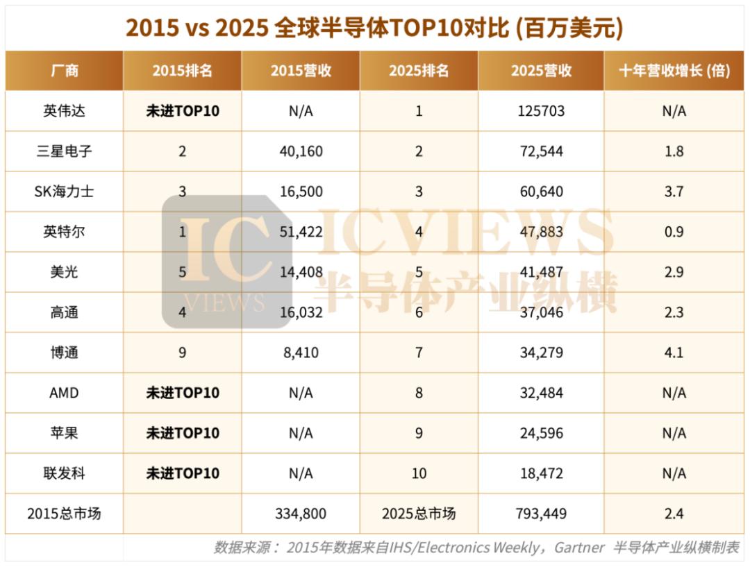 2015年的TOP10中,除了高通和博通,其余大部分都是IDM(集成设备制造商)或拥有强大制造能力的厂商(如英特尔、三星、SK 海力士、东芝、意法半导体、TI)。而到了2025年,TOP10中出现了更多的Fabless(无晶圆厂)或IP/设计驱动的厂商:英伟达、AMD、苹果、联发科。