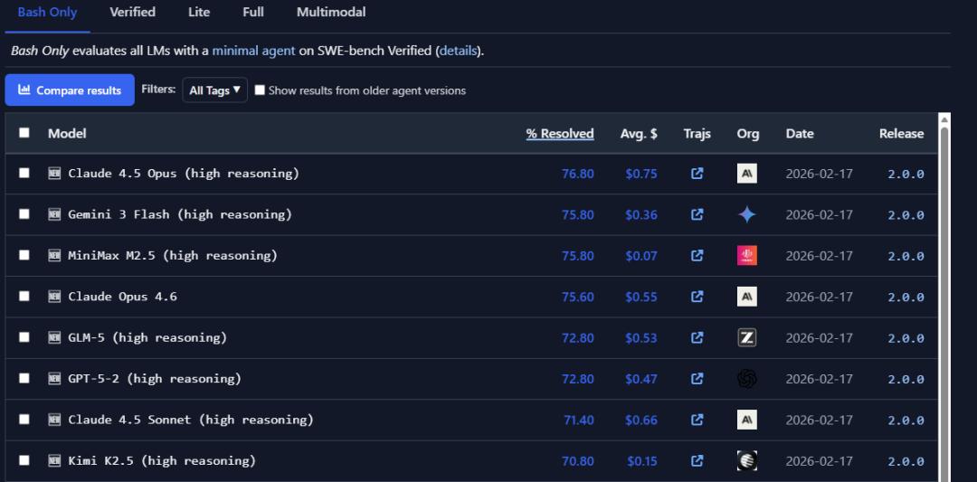 知名技术博主 Simon Willison 使用 mini-swe-agent 对当前主流模型进行了独立测评,结果显示 M2.5 排名第三,仅次于 Claude Opus 4.5 和 Gemini 3 Flash,且是开源模型中的第一名。