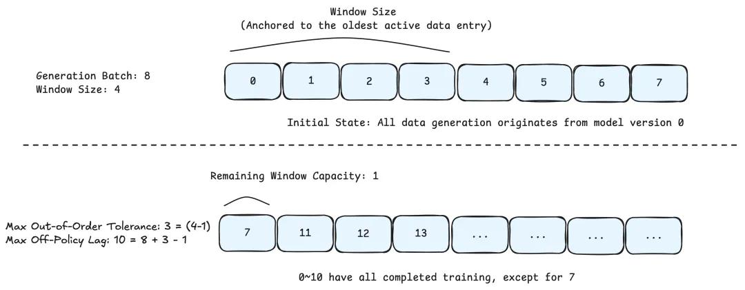 异步调度上,Forge 提出 Windowed FIFO 策略,在最大化系统吞吐量的同时,通过滑动窗口约束控制样本的离策略程度,避免训练分布向「快而简单」的样本严重偏移,兼顾了效率与稳定性。