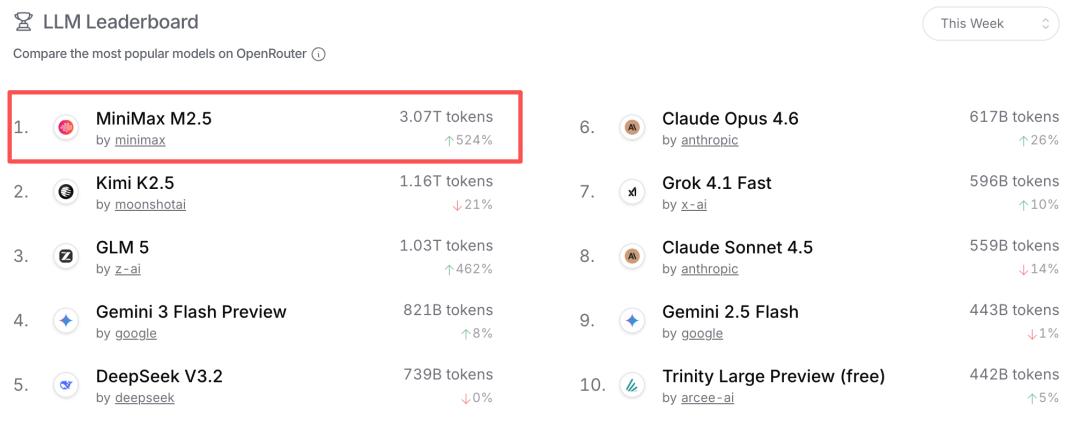 M2.5 发布后 12 小时内登顶 OpenRouter 热度榜,一周内登顶调用量榜首,周调用量暴涨至 3.07T tokens,超过 Kimi K2.5、GLM-5 与 DeepSeek V3.2 三家的总和。