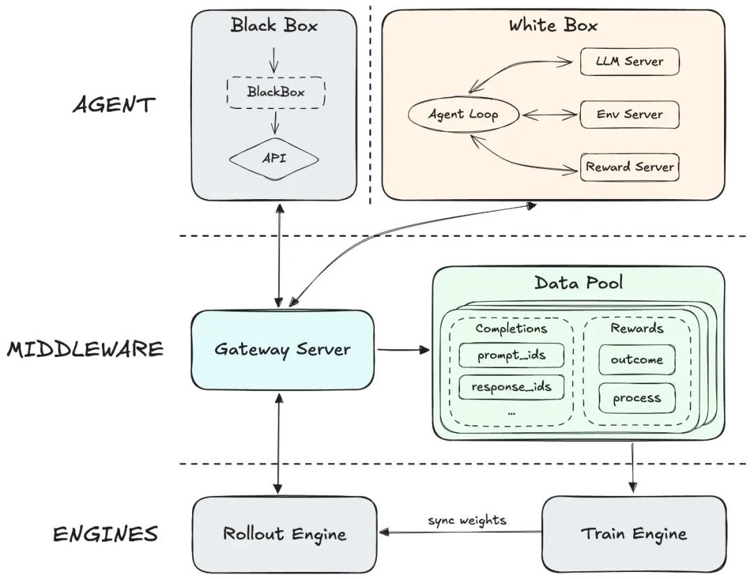 Forge 将 Agent 的执行逻辑与底层训练推理引擎彻底解耦。在此之前,大多数 RL 框架要求把 Agent 当作白盒来处理,Agent 与框架之间需要深度共享内部状态,一旦涉及动态上下文管理或多 Agent 协作,工程复杂度就会急剧膨胀;传统的 Token-In-Token-Out 模式还迫使 Agent 与底层 Tokenizer 深度绑定,维护训练和推理之间的一致性成本极高。