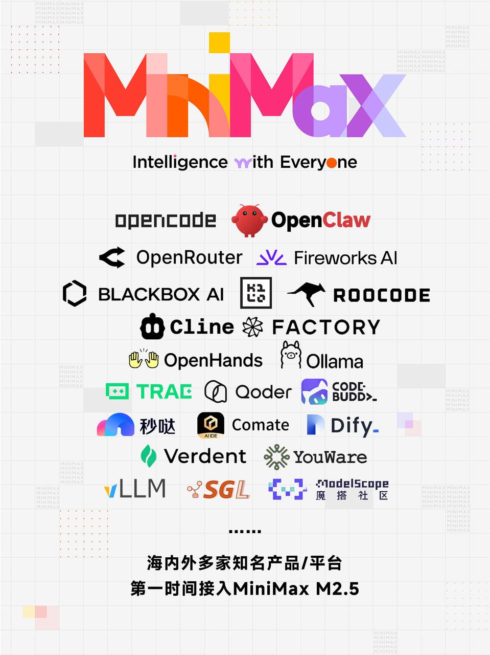 此次 M2.5 发布后随即全面开源,模型权重在 HuggingFace 上发布,支持本地部署,Kilo 再次宣布接入。与此同时,OpenCode、OpenClaw、Fireworks、Factory、TRAE、Cline、OpenHands、Roo Code,以及 Ollama、vLLM、SGLang、Dify、魔搭社区等国内外知名开源 Agent 应用、开源工具平台,也在第一时间接入。