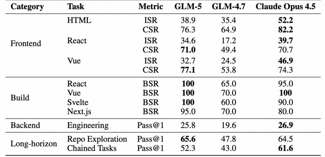 结果显示,GLM-5的构建成功率(BSR)达到98.0%,在检查项成功率(CSR)上与Claude Opus 4.5具备竞争力。