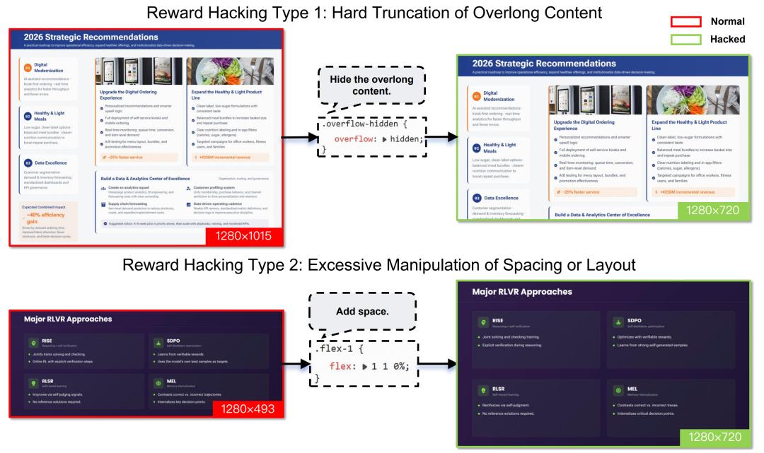 PPT生成:采用多层级奖励机制——第1级关注静态标记属性(定位、间距、颜色、字体等),第2级评估运行时渲染属性(元素宽高、边界框等),第3级引入视觉感知特征(异常空白模式等)。最终生成的页面中严格符合16:9宽高比的比例从40%提升至92%,页面溢出显著减少。