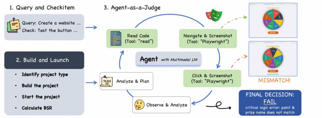 在前端评估中,团队引入了Agent-as-a-Judge技术,通过GUI Agent模拟用户交互,验证生成项目的功能正确性。
