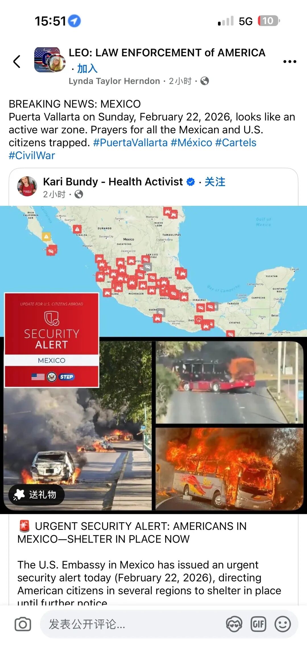目前,中国驻墨西哥大使馆已发布安全提醒,多位在瓜达拉哈拉的中国游客告诉媒体,他们目前被困在酒店内,在墨西哥巴亚尔塔港的一位中国游客看到公路上有燃烧车辆,则被吓得返回酒店。