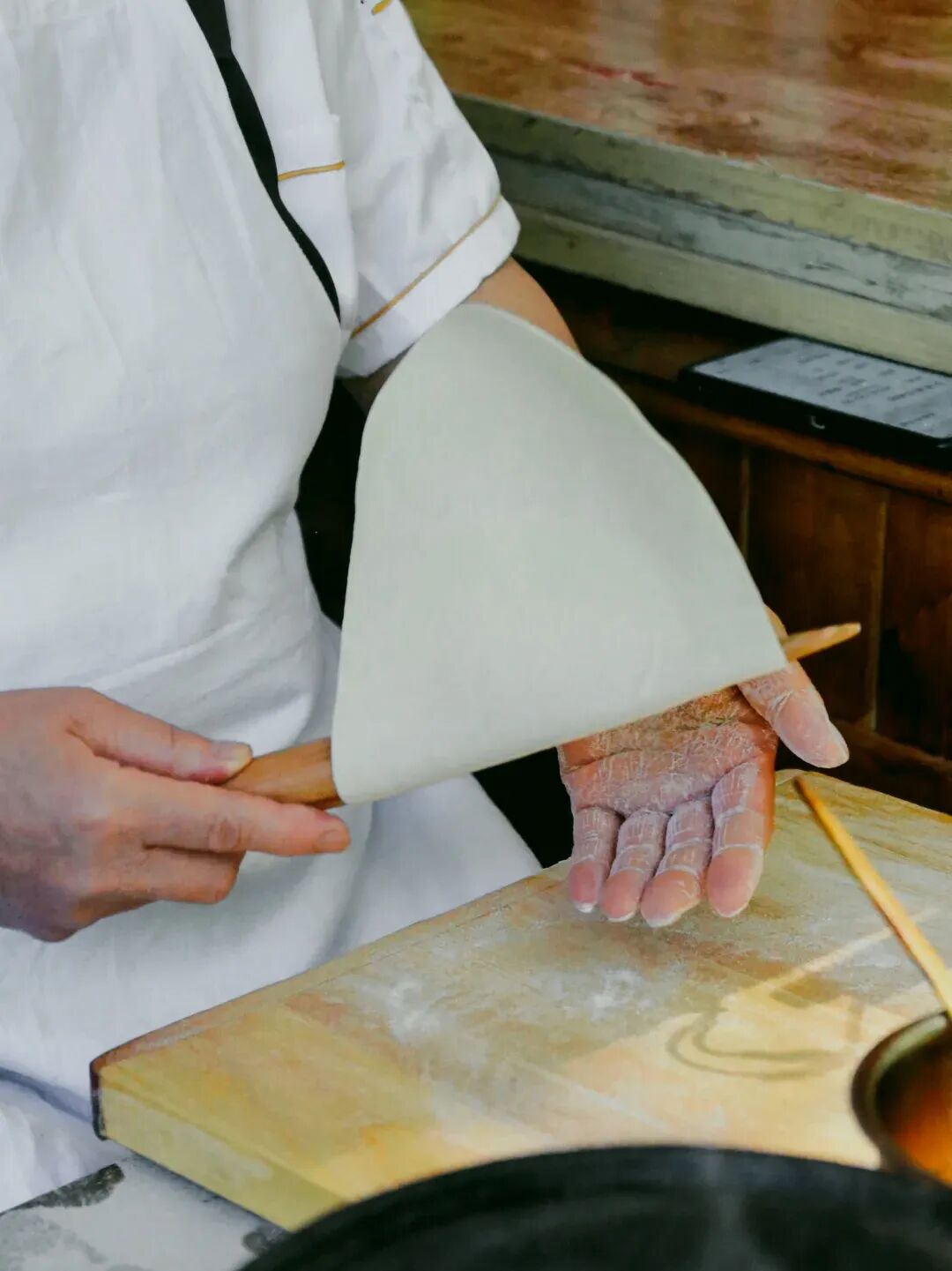 潞城甩饼的制作过程更具观赏性。起源于潞城的甩饼,是春饼的一个品种。面团刷上驴油在师傅手中被反复旋转、拉甩。饼皮在来回的拉扯中薄而不断,正是“甩”这个动作赋予了它一种独特的韧性。