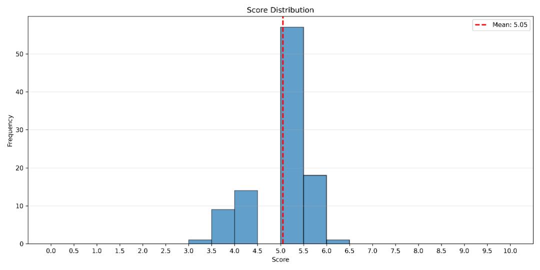 从整体评分结果来看,FARS 产出的 100 篇论文中,平均得分为5.05(区间 3.0–6.3)。