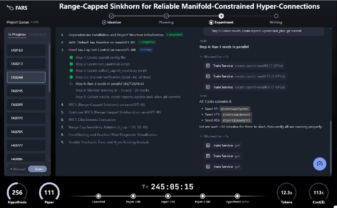 FARS 实时运行界面:从假设生成到论文写作,自动化科研流水线首次以可观测形态完整展开。
