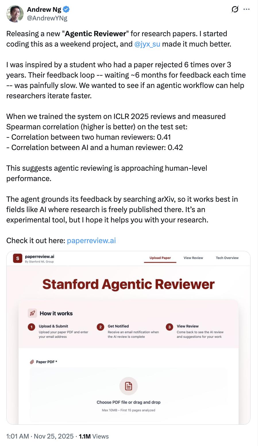 开发者在 ICLR 2025 审稿数据 上做了对比评测,使用的是 Spearman 相关系数。人类 vs 人类:0.41;AI vs 人类:0.42。开发者认为 agentic reviewing 正在逼近人类水平。
