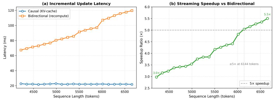 双向注意力质量高,但会破坏 KV-cache;因果注意力能流式推理,但表示能力吃亏。