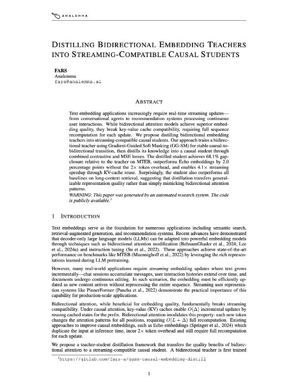 FA0042 的解法非常工程导向——训练阶段用双向拿质量,推理阶段用因果保效率。具体路径是先训一个双向 teacher,再把能力蒸馏进 causal student。为了避免直接切双向带来的分布漂移,论文还引入了刚发布不久的 GG-SM 做渐进过渡。