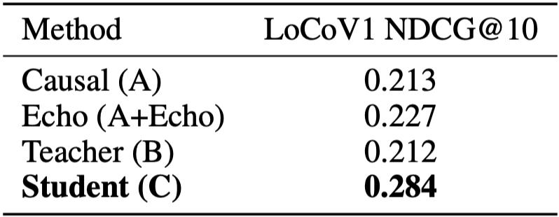 LoCoV1 长文档检索结果。student 模型以 0.284 的 NDCG@10 大幅领先所有 baseline(包括 teacher 的 0.212 ),出人意料。
