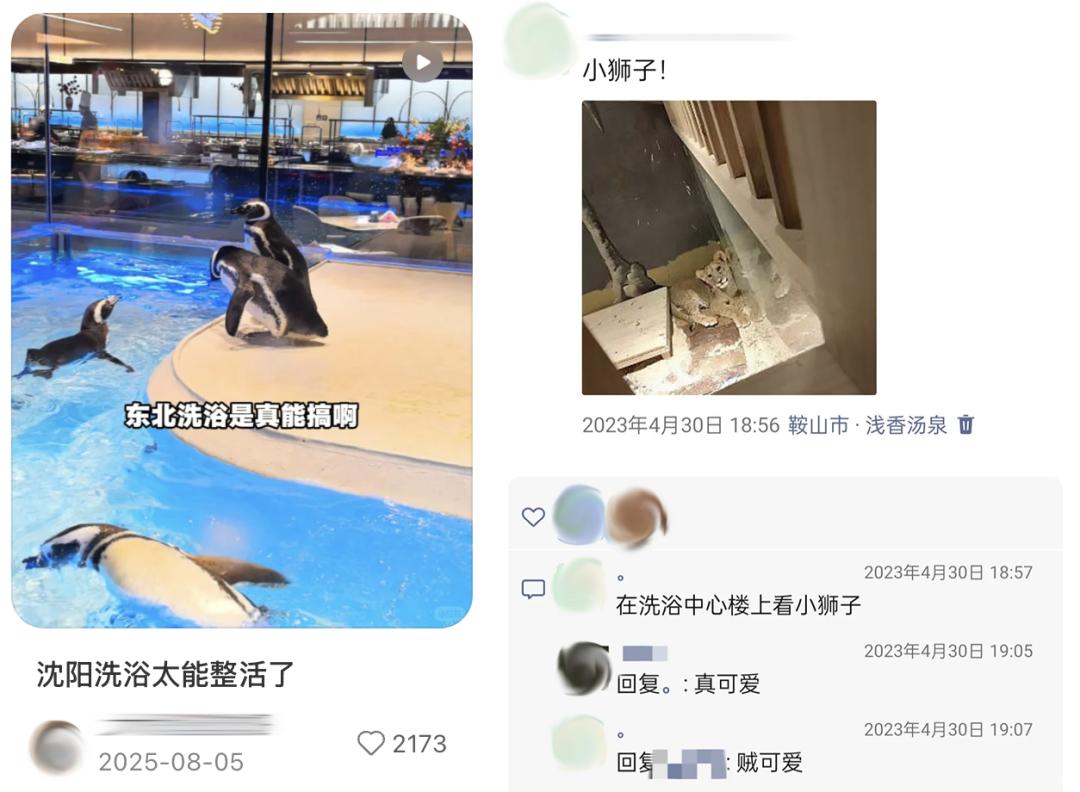 最极端的,连动物都被请进了澡堂,企鹅、狮子、蜥蜴都来陪你泡大澡。沈阳“喜鹊水汇”直接把企鹅搬进了洗浴中心,还有网友曾在别的洗浴中心偶遇过鹦鹉、兔子、蜥蜴和狮子,整活能力令人大脑宕机。