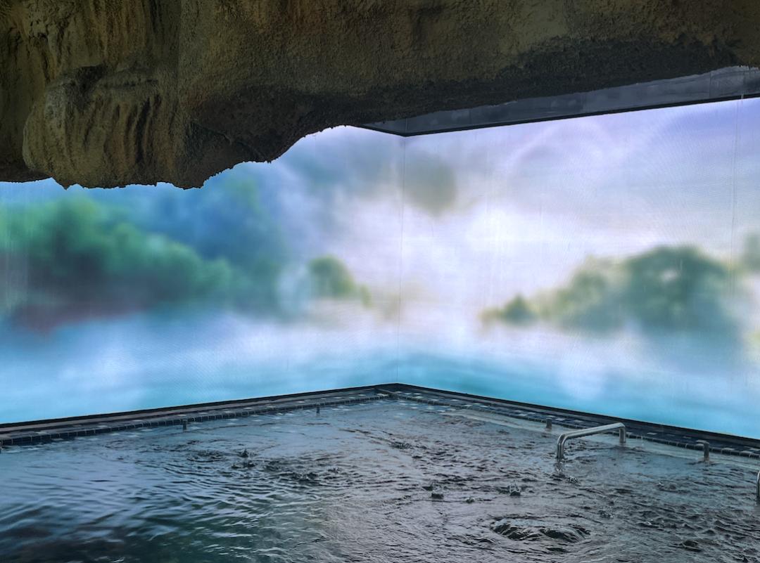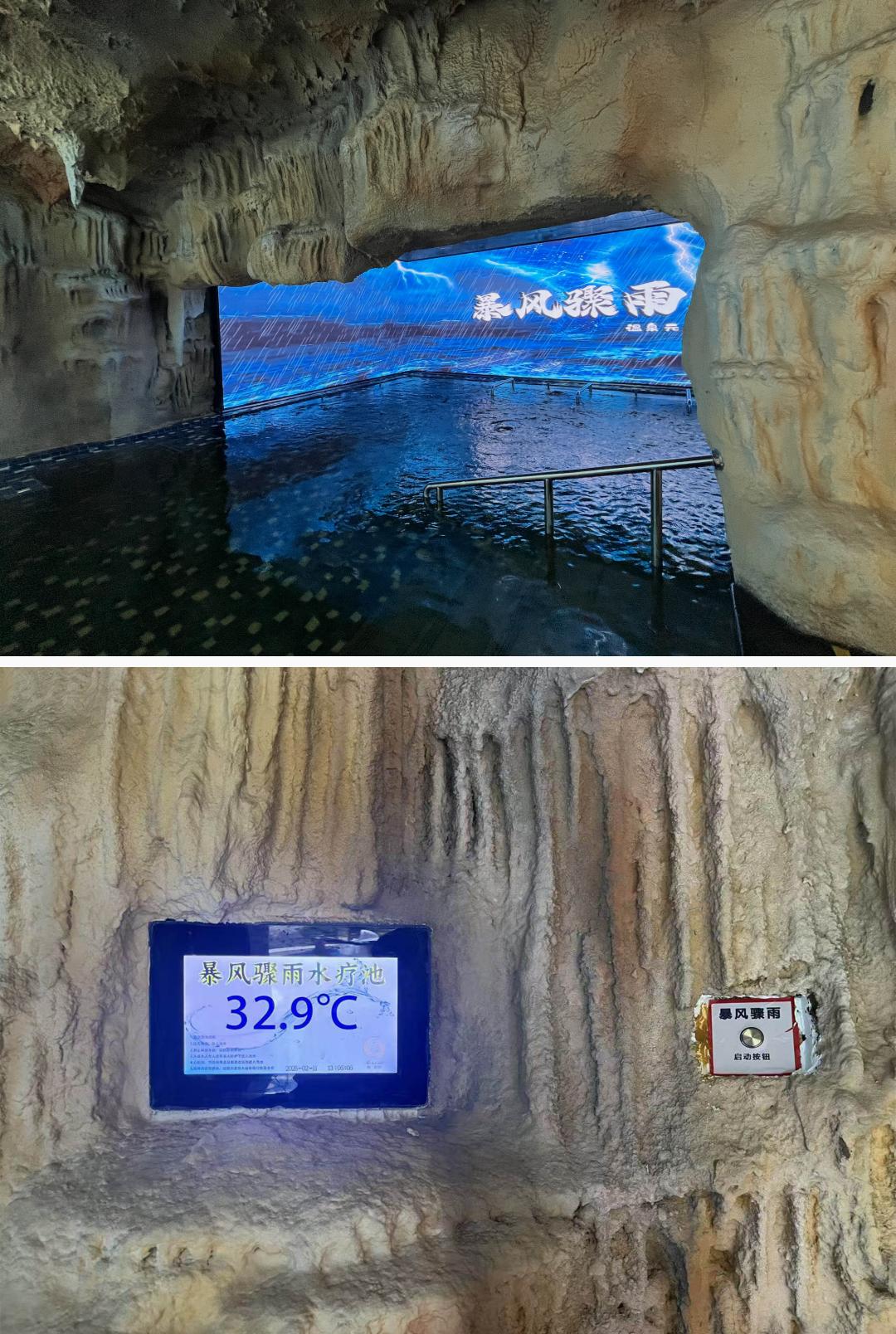 不仅小,而且丑。潦草的洞穴风装修,屏幕上的暴风雨肉眼可见地假,还用领导最爱的行楷字体写着「暴风骤雨水疗」,底下还有一行小字「温泉元宇宙Storm Spa」,知识都学杂了。池水一片漆黑,看不清水质,一种不详的预感油然而生。