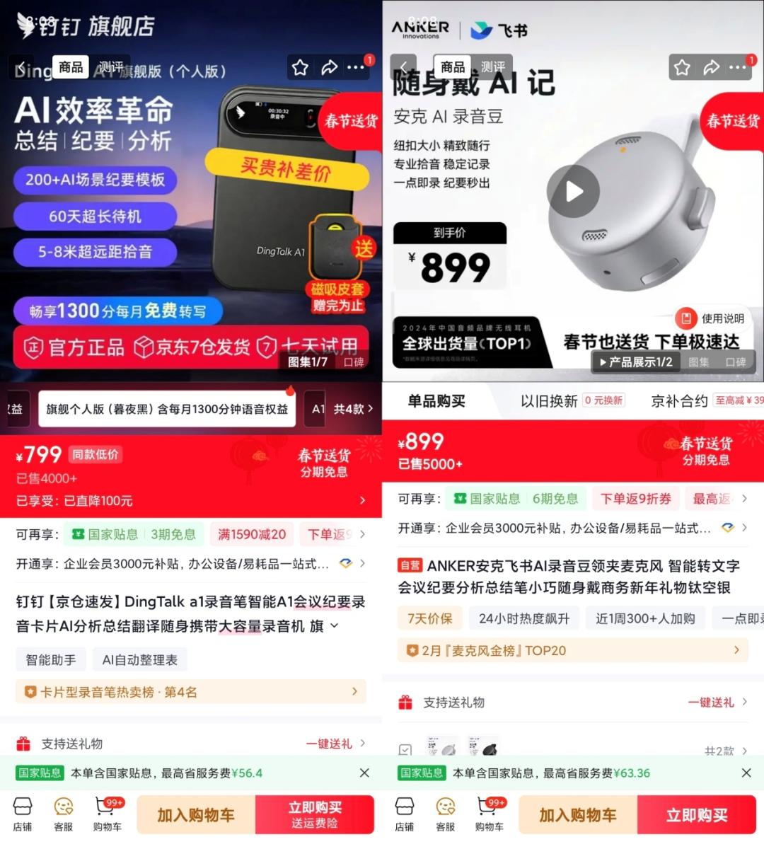 2025年底,钉钉发布DingTalkA1录音卡片和DingTalkReal终端,首批1000台A1售罄。飞书则选择联合安克推出AI录音豆,售价899元。两款产品的目标一致:把会议、对话等语音内容变成可以随时查找的记录,争夺企业办公入口。