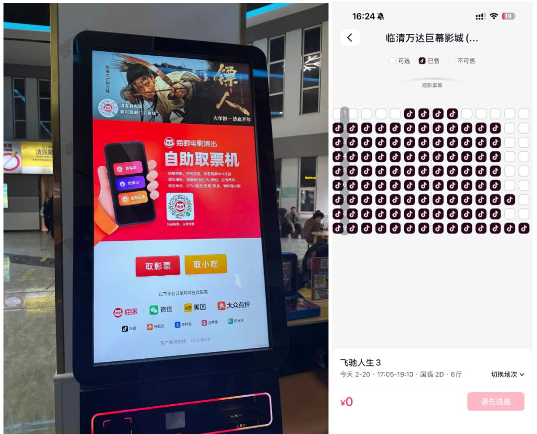 影院的自助取票机前,不少人都在操作抖音订单取票,工作人员说主要是春节上抖音推出的代金券优惠,大家肯定都愿意选更划算的方式。