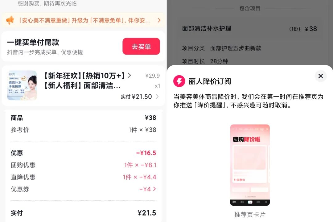 21.5元的套餐价格,是我综合对比多个平台之后的全网最低团购价。在团购过程中,抖音团购会弹窗询问“是否接收来自丽人降价订阅”,这种提前征得同意的小细节,感觉是站在用户向的设计。