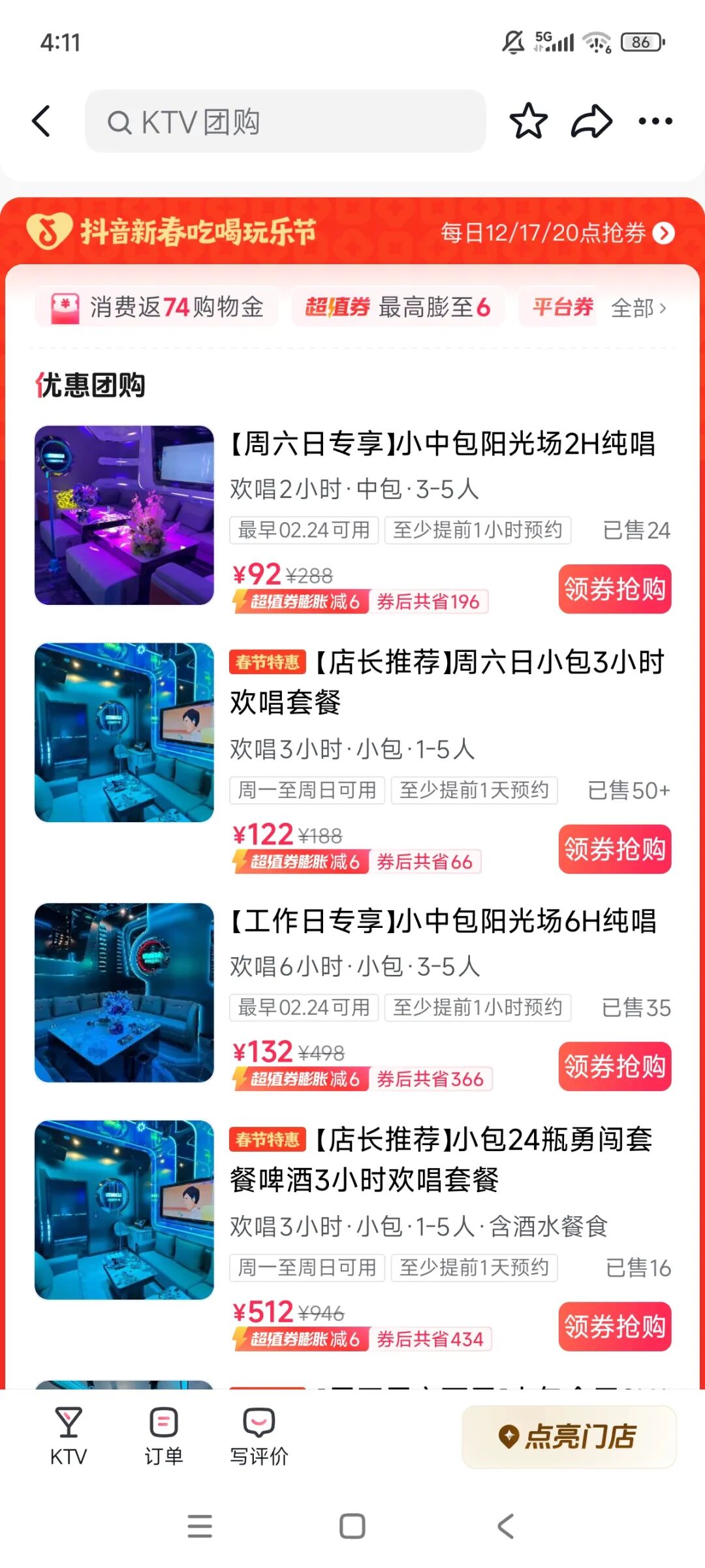 作为价格敏感人群,一定会“货比三家”看哪家价格最合适。互联网大战让我们普通人养成了比价的习惯,抱着“可以买贵的,不能买贵了”的消费心理,我对比了抖音、美团多个平台价格发现,其他平台上的便宜团购套餐都显示“今日不可用”,想去唱歌得200多元起步。抖音上多个团购套餐也是不可使用,但留了一些价格相对合适的便宜套餐,小包间3小时122元。平台发放了一些超值券膨胀,还有品类券,最后下来还是比较划算。