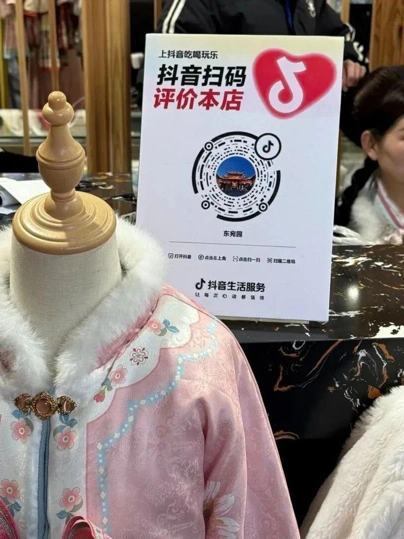逛园途中,汉服租赁店前格外热闹,不少年轻人正围着衣架挑选款式,店铺门口的显眼位置贴着醒目的抖音团购二维码。我好奇地扫了一下,直接跳转至景区的抖音评价栏,景区评价一目了然。