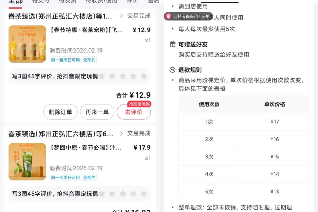 现在的团购套餐灵活度也很高,以抖音团购为例,5杯的眷茶团购套餐,如果没有全部核销,可以进行梯队价格退款。而且,即使只核销一杯,其价格也要优于单纯团购一杯价格。
