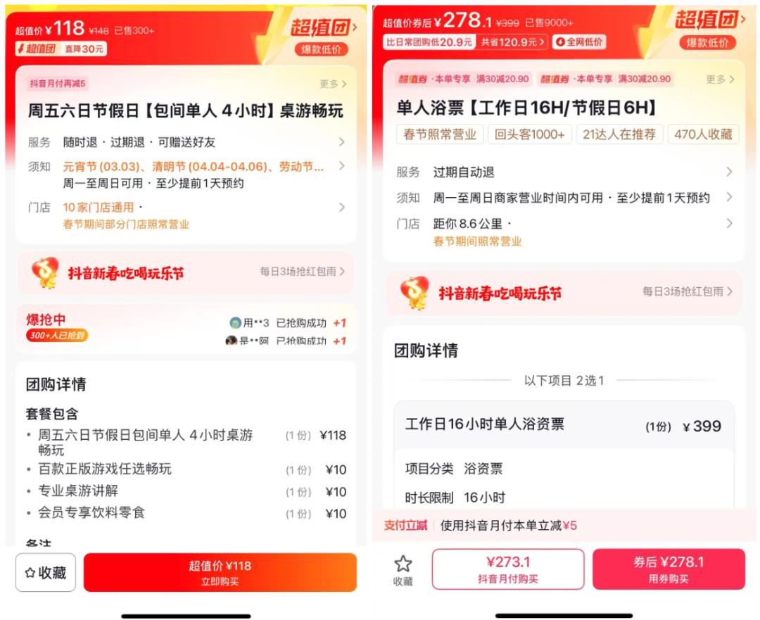 还有一点,抖音团购做得用户体验比较直接,不可使用的团购套餐它会在页面显示可使用日期“最早02.24可用”。