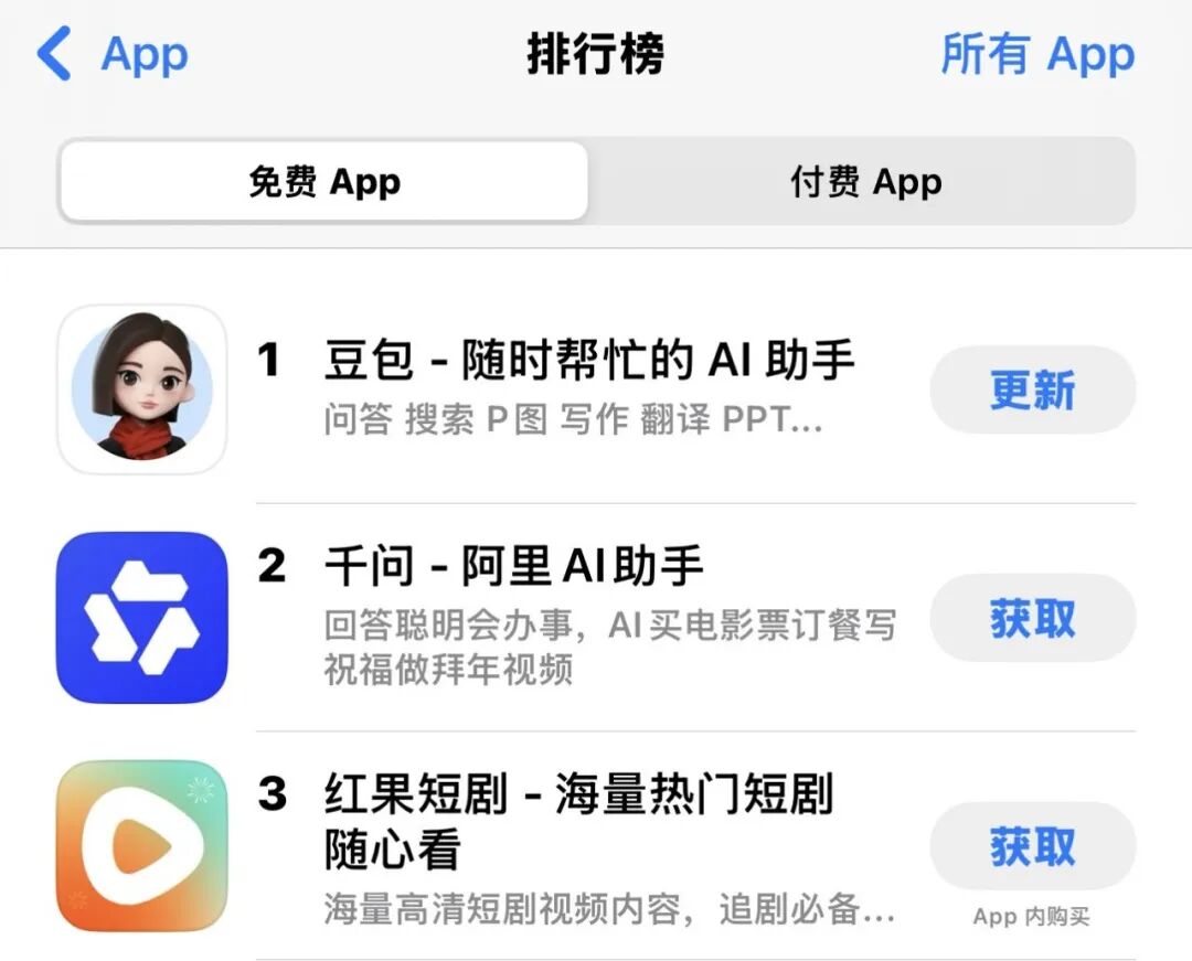从最新App Store免费排行榜看,去年9月月活就达1.72亿的字节豆包依然排在第一位。它的领跑,源于“技术+情感”的双重卡位。