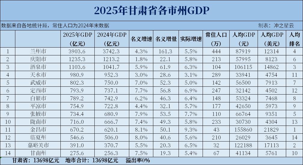 比如,2025年,甘肃全省的GDP总量不足1.4万亿元,在全国各省份中位居倒数第五,比西北第一城西安的GDP还低。