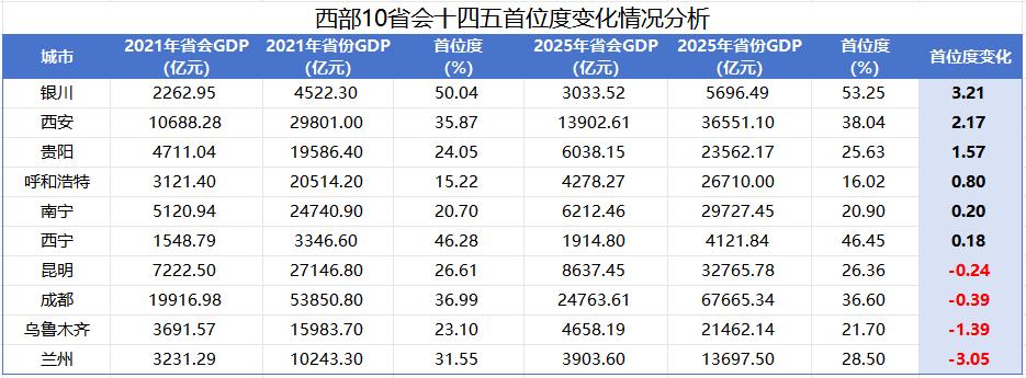 然而,另一个关键指标显示,兰州的“强省会”建设依然任重而道远:兰州的首位度在过去几年中非但没有提升,反而出现下滑,从2021年的31.55%降至2025年的28.5%。