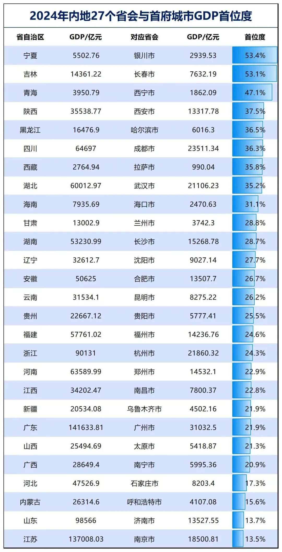 这里需要澄清一个常见的认知误区。近年来,人们谈论“强省会”时,往往习惯于拿“首位度”说事。但这一指标其实具有很大的误导性。例如,按此指标,银川、长春、西宁的“首位度”最高,其GDP占全省比重接近或超过一半。