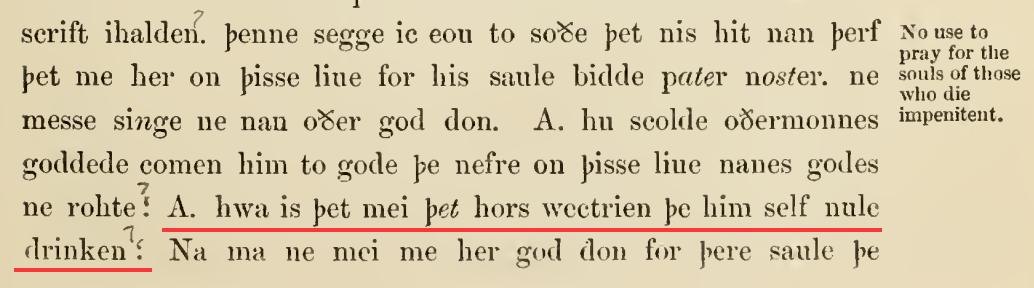 划线句大意是:“啊!谁能逼着一匹不想喝水的马儿喝水呢?”丨《十二至十三世纪古英语的讲道法及讲道论述 第一辑》,早期英语文本协会,1868