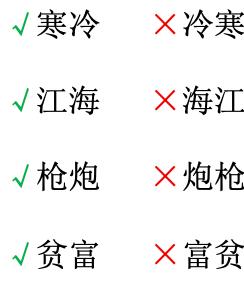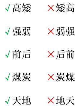 不知看官您找到规律了吗?其实“义序”不能用,我们就可以思考一下“音序”。在这个问题上,最重要的其实是声调[2][3]:上面举出的所有例子,全都是按照一声(阴平)最前,二声(阳平)次之,三声(上声)靠后,四声(去声)最后的顺序排列的。这种“调序法则”自上古时期一直流传到今天,足可解释80%-90%的并列语素排序问题。