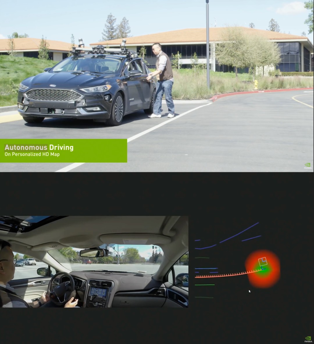 *图片来源:英伟达 GTC 2018 - NVIDIA CEO Jensen Huang Keynote;黄仁勋在GTC现场演示英伟达的自动驾驶,图中人物即为王一舟
