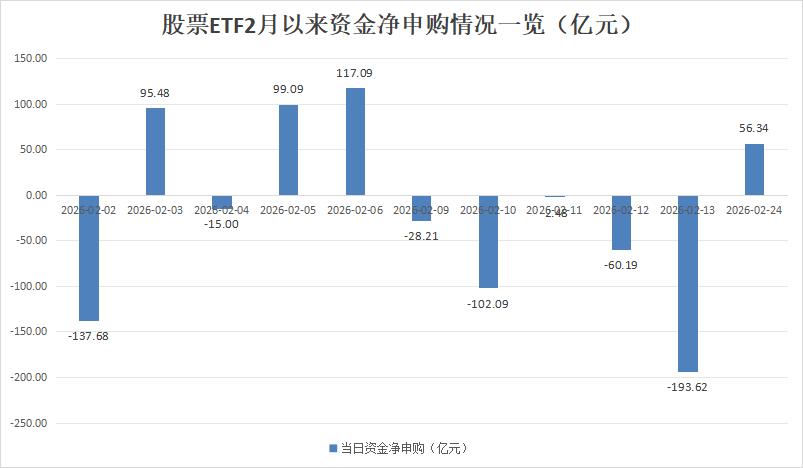 据银河证券基金研究中心数据统计,2月24日,全市场股票ETF(含跨境ETF)资金净流入56.34亿元,一改年前五个交易日资金净流出的状态。