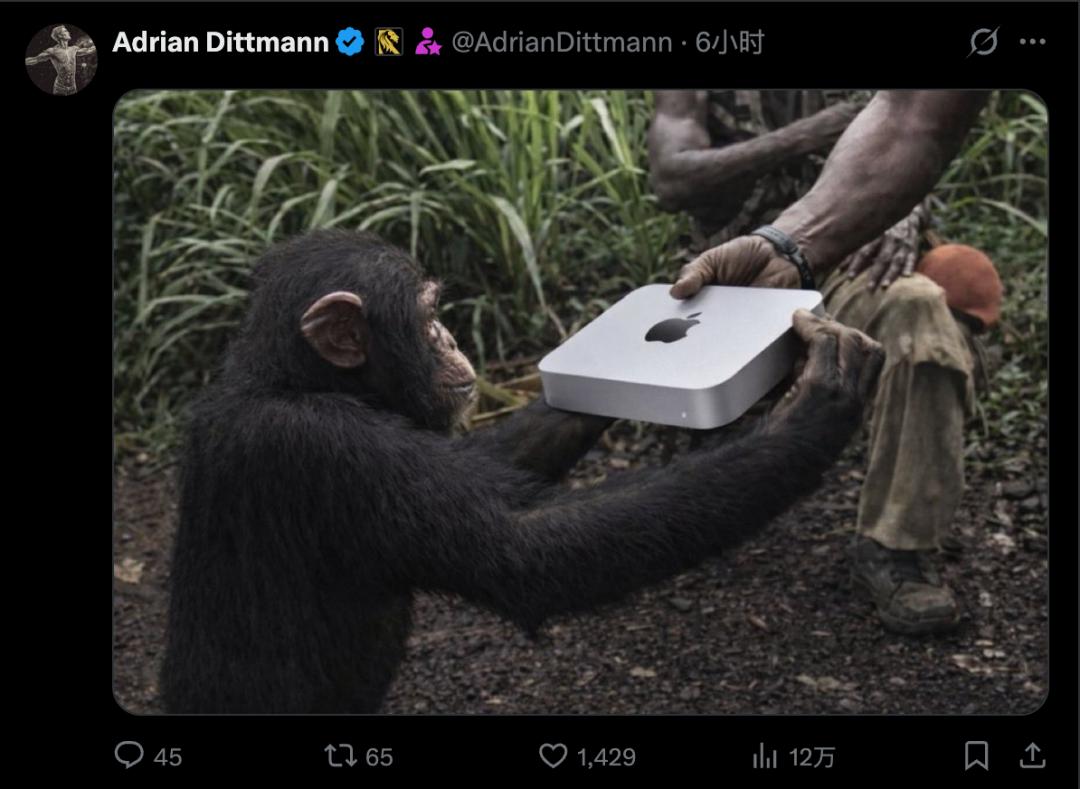 他转发了一段《猩球崛起》的病毒视频——士兵把一把上了膛的AK-47递给猴子。