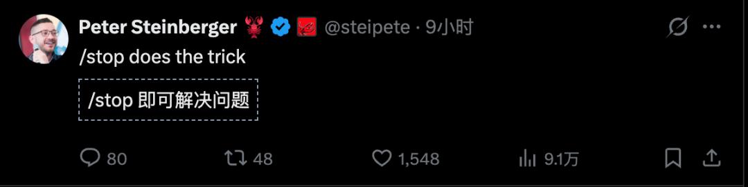 这里插一句,OpenClaw之父第一时间回复了解决方案,只需/stop。你知道吗?