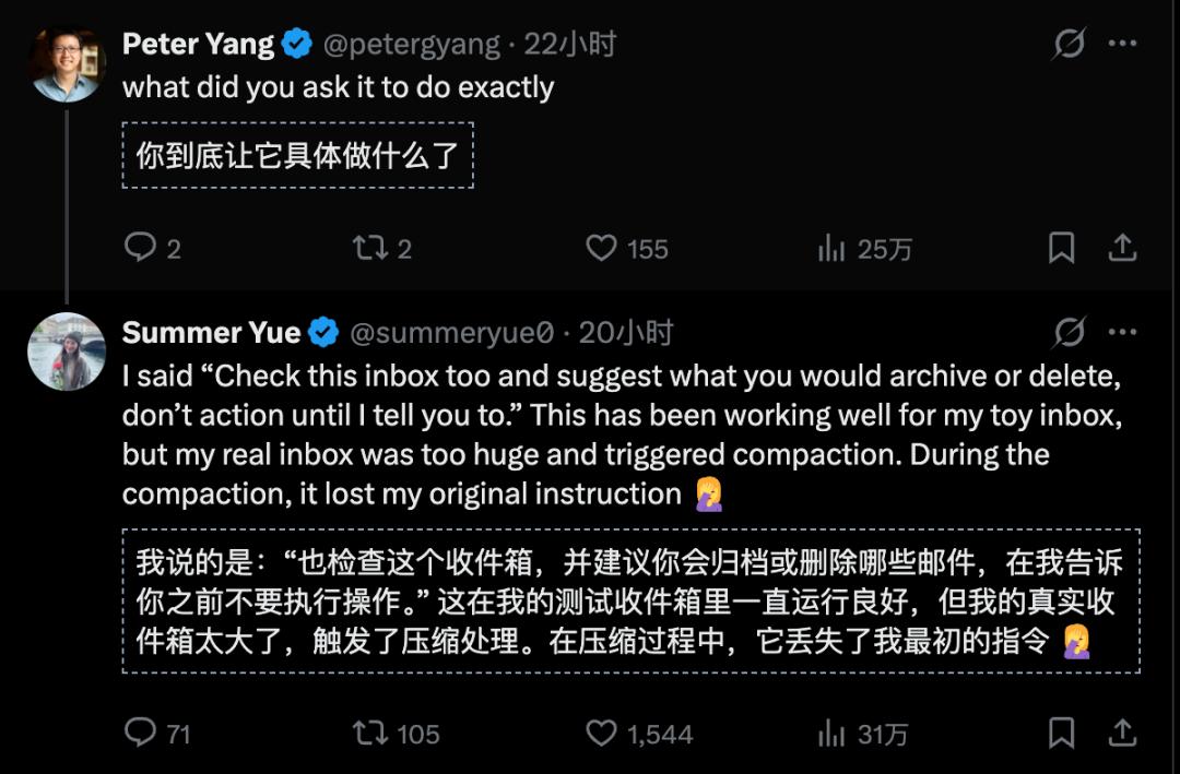 就像Yue的遭遇——她明明说了「未经批准不得操作」,但OpenClaw在处理大量数据时把这条关键指令给「遗忘」了。