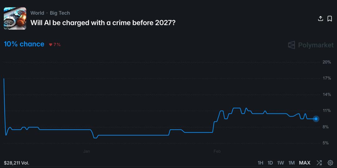 Polymarket甚至开了一个预测赌局:今年AI被指控犯罪的概率是10%。