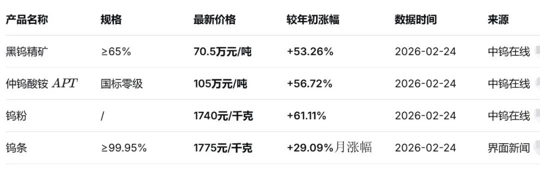 我们先来看一组热乎的数据。根据中钨在线的最新统计,截至2026年2月24日,钨产业链上下游已经全线飘红。