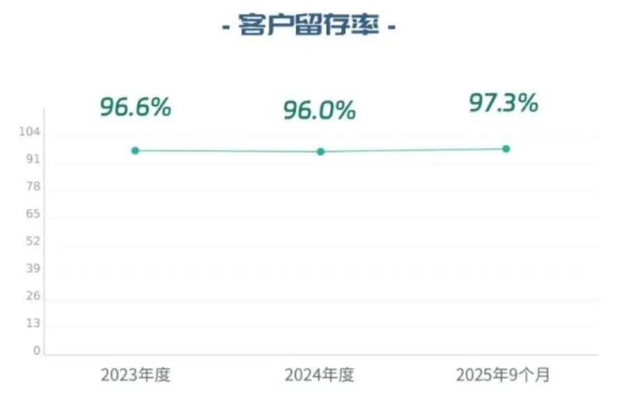 现有数据即可充分佐证,2023年、2024年及2025年前三季度,其客户留存率分别为96.6%、96.0%及97.3%。如此优质的高留存率也让其成为一众行业分析师重点关注的标的。