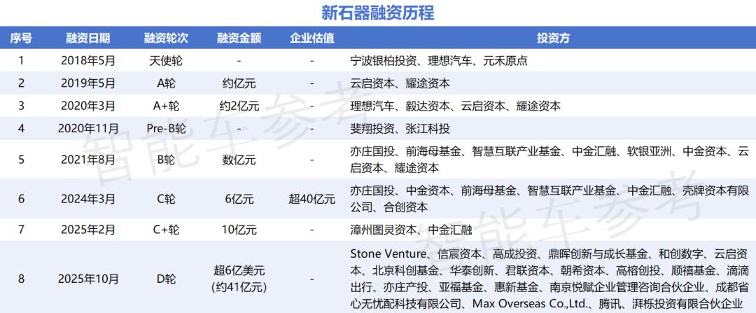 理想汽车、云启资本、元禾起点等是新石器的早期投资者;公司最新的D轮融资还有滴滴、腾讯、阿联酋磊石资本、君联资本等加入。