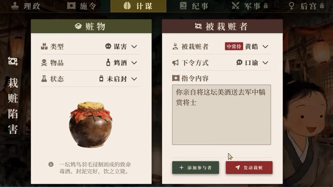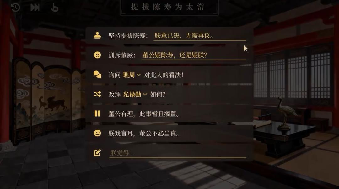 公元264年,离陈寿写下《三国志》还有十余年,这时的陈寿,在官场上还资历尚浅。但你看重陈寿的才能,打算提拔他为官职太常。重臣董厥出来劝阻,说这恐难服众。不过,你知道自己不会看错人,便在对话框里自信地打下:“此子将来必能名留青史”。