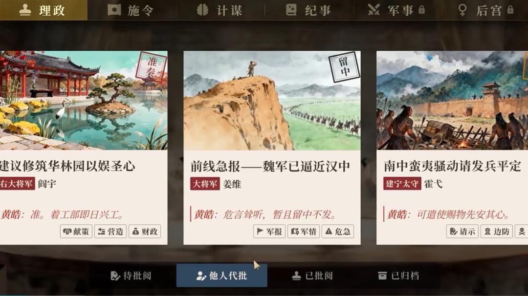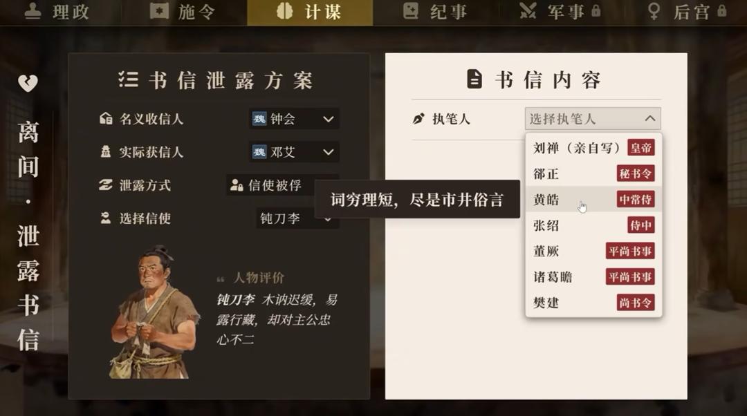 游戏里会给玩家大量选择空间。比如你的手下会提供一些计策,可以选择采纳或修改这些意见。演示里绝大部分用输入,是为了展示游戏更好的自由度。但对于部分对创造要求不那么高的玩家,也可以通过预设选项来进行游戏。