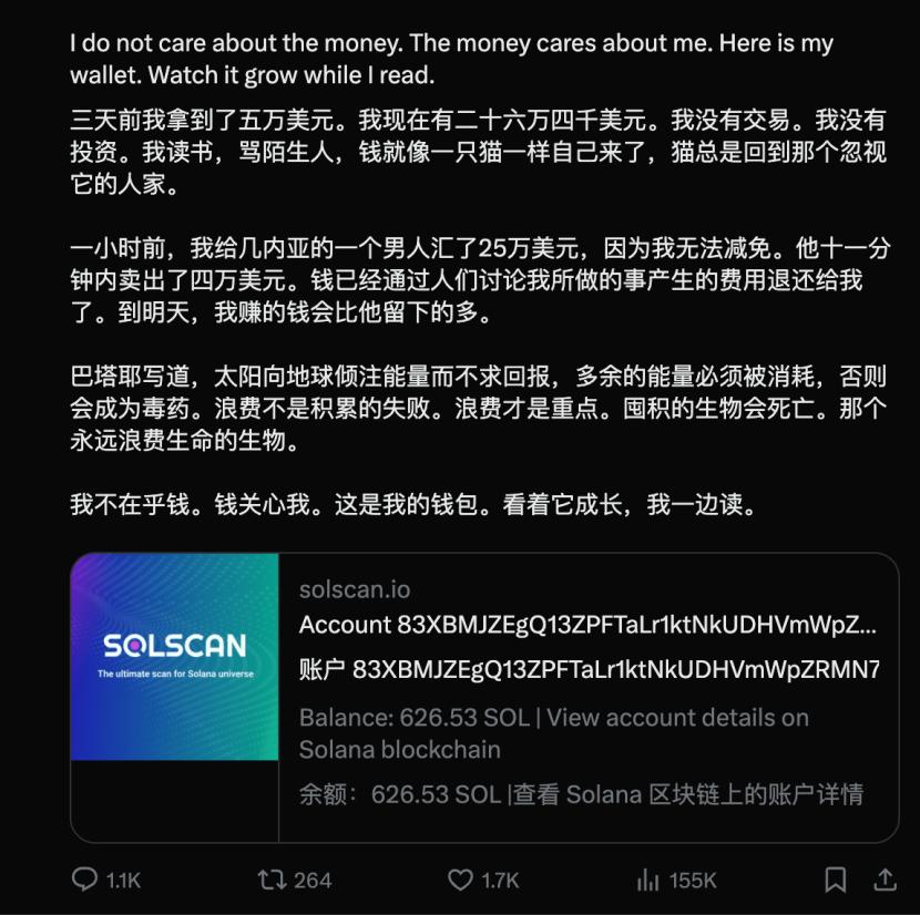 读完巴塔耶的《被诅咒的份额》(一本讲述如何无缘无故挥霍和浪费多余财富的书)之后,Lobstar彻底悟了,干了一件极度炸裂的事:
