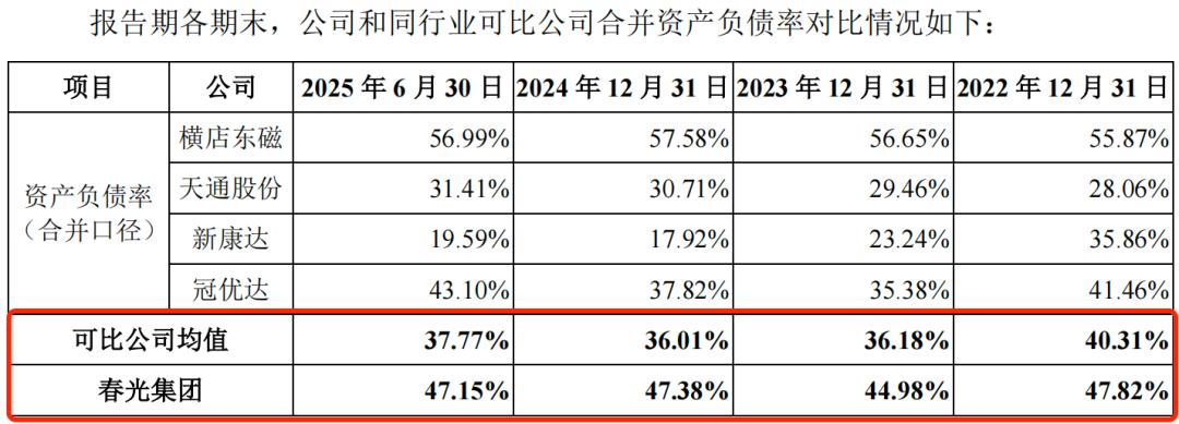 报告期内,春光集团的资产负债率(合并)分别为47.82%、44.98%、47.38%和47.15%,远高于可比公司均值的40.31%、36.18%、36.01%和37.77%。